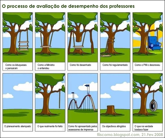 Esta imagem é uma adaptação de uma outra sobre o processo de desenvolvimento de software. Surpreendentemente com semelhanças a mais com o Ministério da Educação planeou como forma de reduzir custos.